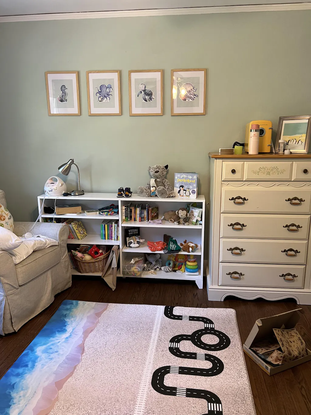 I'm totally obsessed with this play mat! I scoured the internet for a mat that was wipe-able, with an ocean theme, and made of materials that would be comfortable to walk/crawl on. This mat checks all the boxes! It is super cushiony, a dream to walk/play on. My toddler loves the road for her toy cars. It's great to be able to have a road design that is still somehow pretty to look at. This mat seriously was the finishing touch for our son's aquatic nursery and the road keeps the toddler occupied while we feed the newborn. I can't say enough good things about this mat.