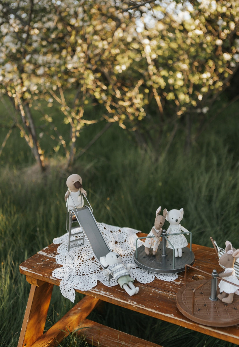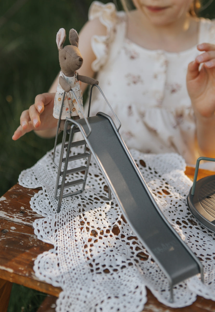 We’ve added an extra piece to the metal slide purely for aesthetics (see video in product images), a sweet little detail to elevate your display. It’s completely optional for play, but perfect for styling your miniature playground.